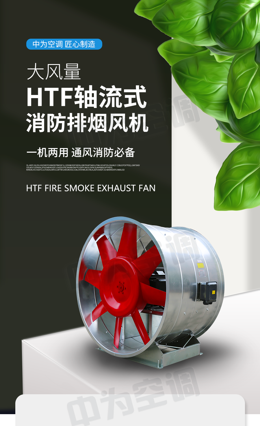 HTF系列風機設計獨特,高溫電機全封閉內置,配設專門的電機冷卻系統,采用CAD軟件多目標優化設計的軸流和混流葉輪結構,通過多選驅動形式,達到一機兩用(即常用送排通風和消防使用時高溫排煙),配設電控箱后可遠程自動控制。具有耐高溫性能優良、效率高、體積小,安裝簡便(水平、垂直、吊裝均可)等優點,廣泛應用于高層建筑、烘房、地下車庫、地鐵、隧道等場合消防排煙和送排通風。按GA211-1999按《消防排煙風機耐高溫試驗方法》測定,能在280℃高溫條件下連續運行40分鐘以上,已被全國各大城市消防部門認可采用。