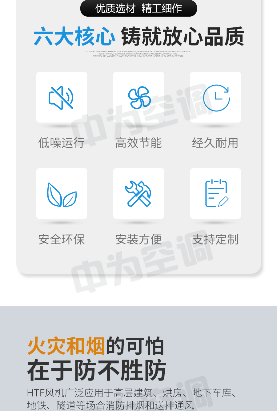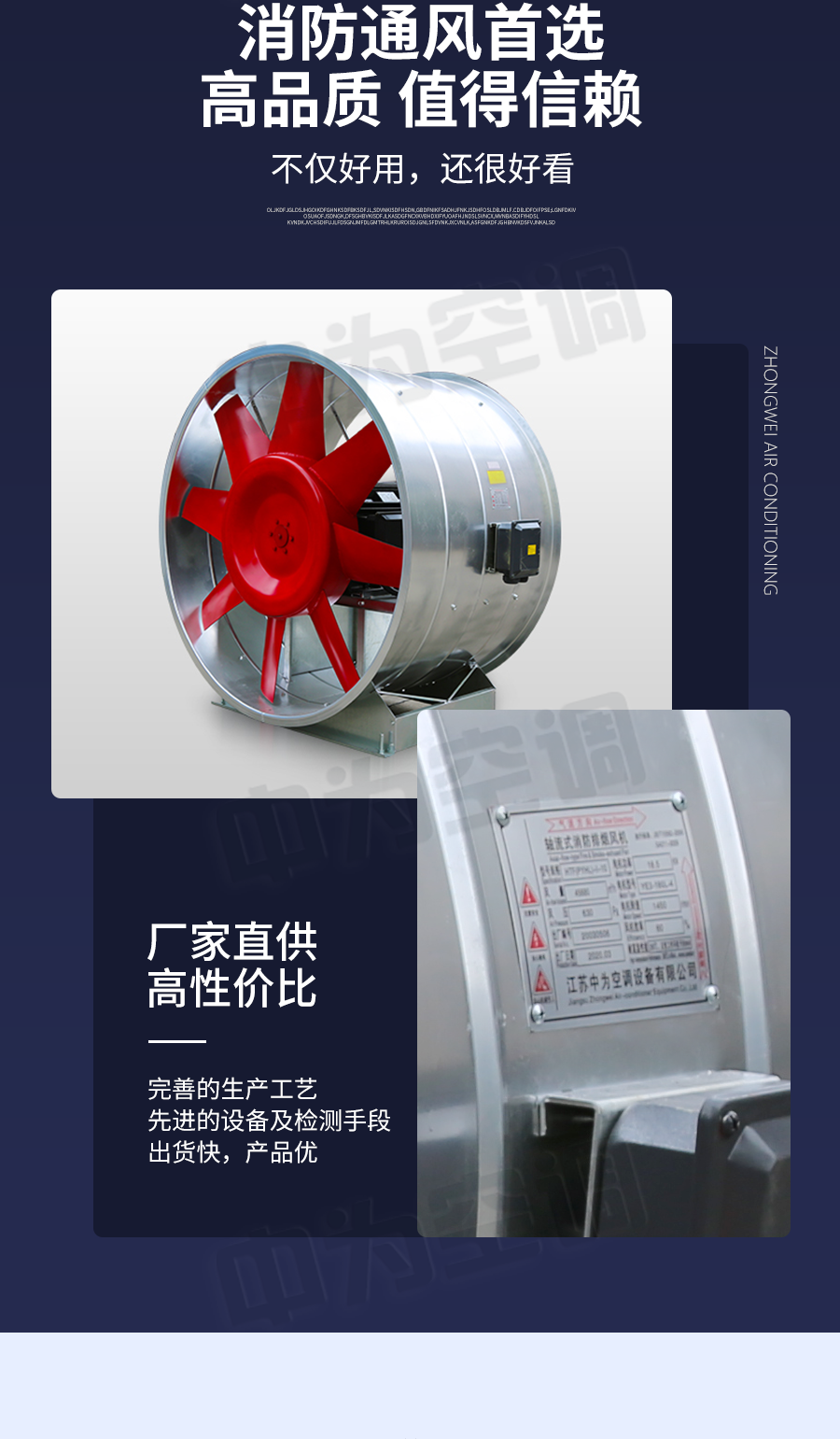 中為消防風機設計獨特,高溫電機全封閉內置,配設專門的電機冷卻系統,采用CAD軟件多目標優化設計的軸流和混流葉輪結構,通過多選驅動形式,達到一機兩用(即常用送排通風和消防使用時高溫排煙),配設電控箱后可遠程自動控制。具有耐高溫性能優良、效率高、體積小,安裝簡便(水平、垂直、吊裝均可)等優點,廣泛應用于高層建筑、烘房、地下車庫、地鐵、隧道等場合消防排煙和送排通風。按GA211-1999按《消防排煙風機耐高溫試驗方法》測定,能在280℃高溫條件下連續運行40分鐘以上,已被全國各大城市消防部門認可采用。