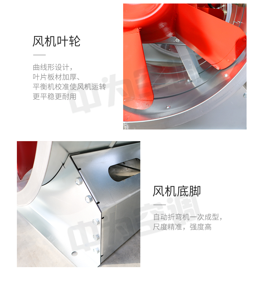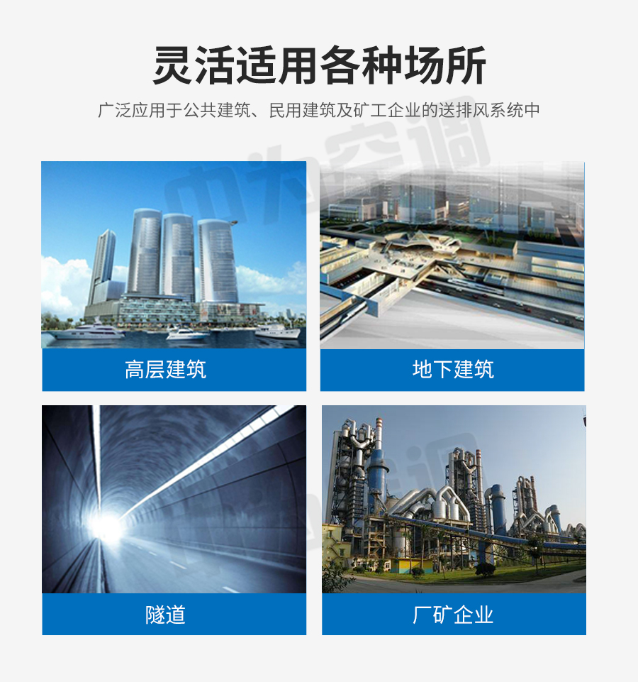 中為消防風機設計獨特,高溫電機全封閉內置,配設專門的電機冷卻系統,采用CAD軟件多目標優化設計的軸流和混流葉輪結構,通過多選驅動形式,達到一機兩用(即常用送排通風和消防使用時高溫排煙),配設電控箱后可遠程自動控制。具有耐高溫性能優良、效率高、體積小,安裝簡便(水平、垂直、吊裝均可)等優點,廣泛應用于高層建筑、烘房、地下車庫、地鐵、隧道等場合消防排煙和送排通風。按GA211-1999按《消防排煙風機耐高溫試驗方法》測定,能在280℃高溫條件下連續運行40分鐘以上,已被全國各大城市消防部門認可采用。