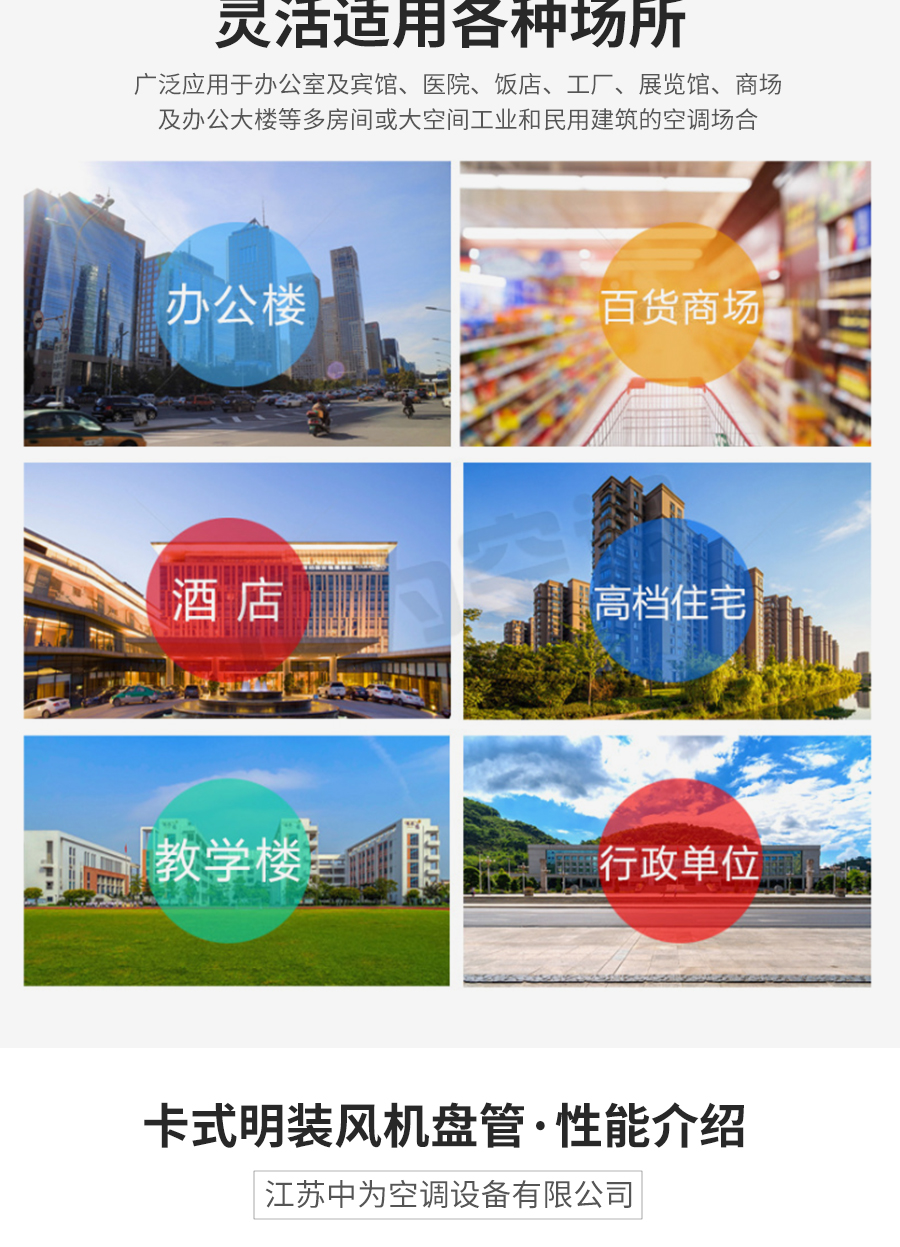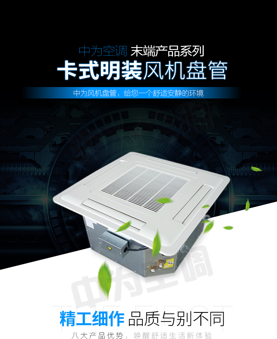 中為卡式明裝風機盤管是中央空調理想的末端產品,其工作原理是機組內不斷的再循環所在房間或室外的空氣,使空氣通過冷水(熱水)盤管后被冷卻(加熱),以保持房間溫度的恒定。外形美觀,與新風機組配套后廣泛應用于賓館、醫院、辦公用房、高級會議廳、展覽廳等低噪聲場所。