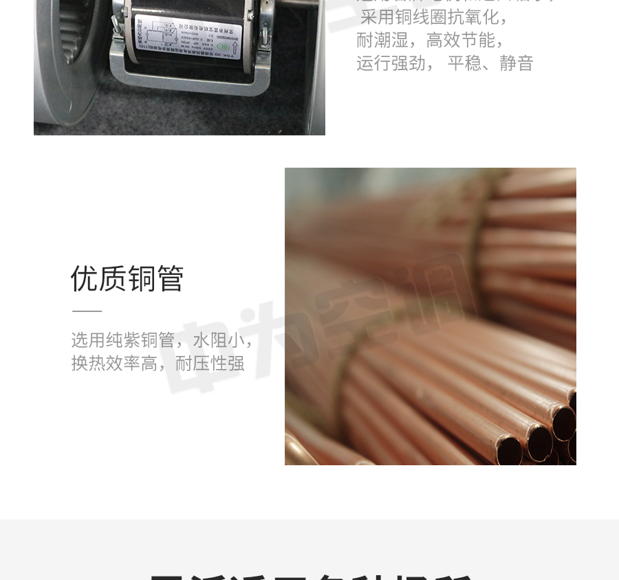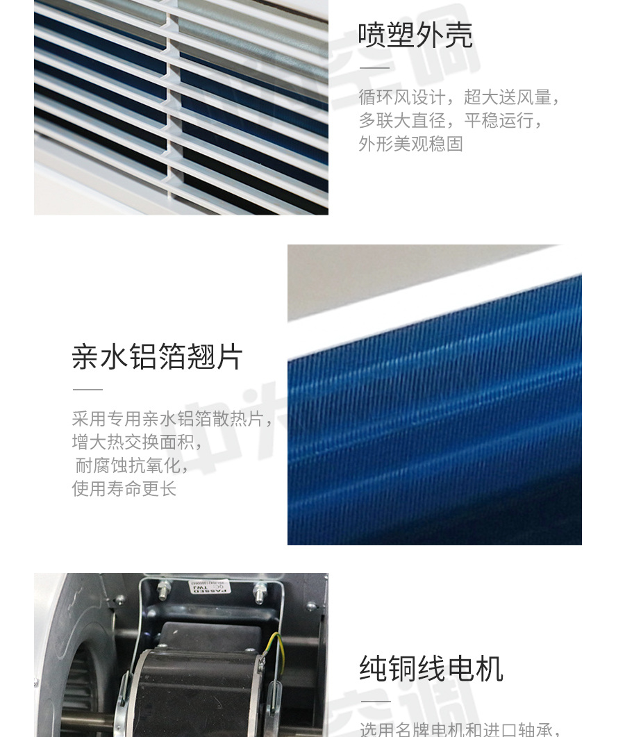中為臥式暗裝風機盤管是中央空調理想的末端產品,其工作原理是機組內不斷的再循環所在房間或室外的空氣,使空氣通過冷水(熱水)盤管后被冷卻(加熱),以保持房間溫度的恒定。雙保風機盤管采用優質薄壁無縫紫銅管與親水鋁翅片,經液壓或機械漲管而成,傳熱系數高,韌性好,強度大,可承受高水壓,可以在超高層建筑使用。