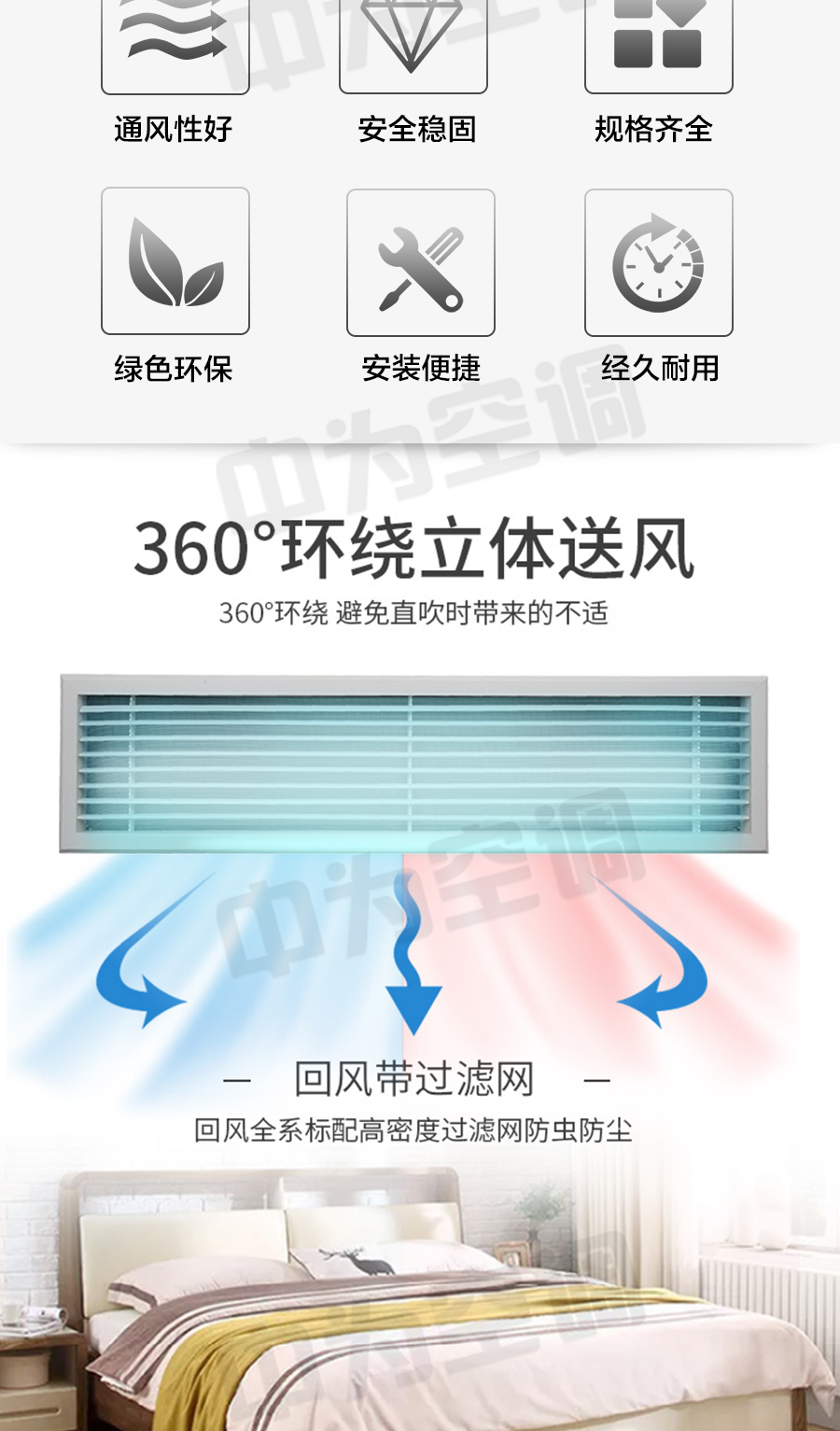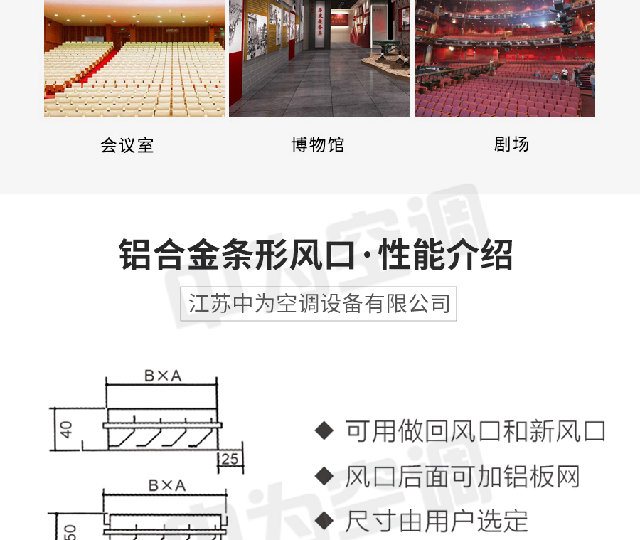中為鋁合金條形風口做回風口和新風口,風口后面可加鋁板網,尺寸由用戶選定,功能多樣,種類齊全。