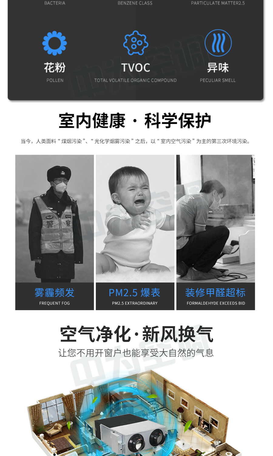 中為全熱交換器是提供新鮮空氣的一種空氣調節設備。功能上按使用環境的要求可以達到恒溫恒濕或者單純提供新鮮空氣。工作原理是在室外抽取新鮮的空氣經過除塵、除濕(或加濕)、降溫(或升溫)等處理后通過風機送到室內,在進入室內空間時替換室內原有的空氣。