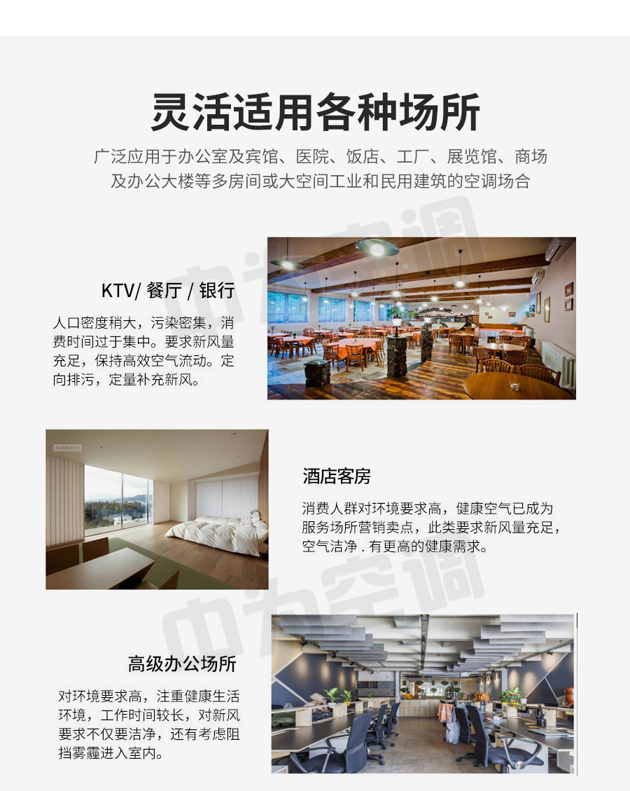 中為柜式空調機組可實現對空氣的加熱、冷卻、加濕、過濾凈化等多種功能。廣泛應用于賓館、商場、機場、醫院、寫字樓等大中型公共建筑的舒適性空調和電子、紡織、化工、制藥、食品等行業的工藝性空調。該機組不僅具有制冷供熱性能優越、噪音低、高度薄、結構緊湊、重量輕、安裝維護方便的優點,而且還可以配上調頻或調壓變速控制器后。按四季不同工況與現場空調場合匹配進行變風量節能運行。因此特別適用于建筑物緊湊的各類空調工程場合使用。