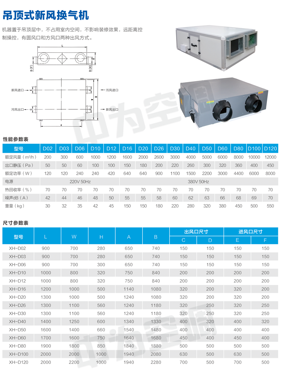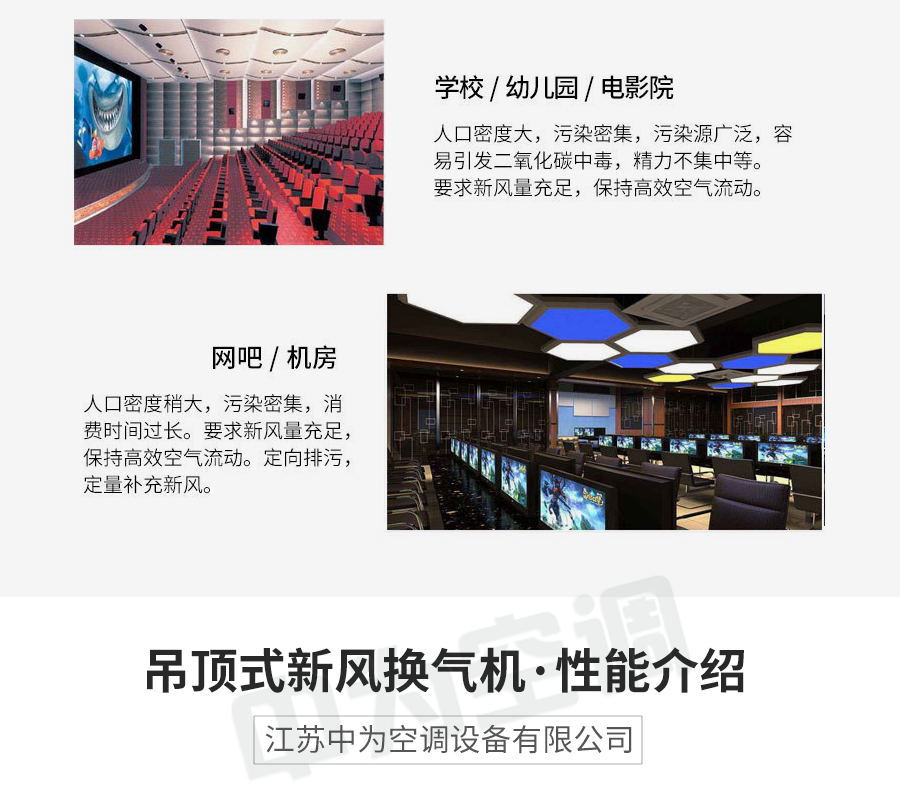 中為吊頂式新風機組是提供新鮮空氣的一種空氣調節設備。功能上按使用環境的要求可以達到恒溫恒濕或者單純提供新鮮空氣。工作原理是在室外抽取新鮮的空氣經過除塵、除濕(或加濕)、降溫(或升溫)等處理后通過風機送到室內,在進入室內空間時替換室內原有的空氣。當然以上所提到的功能得根據使用環境的需求來定,功能越齊全造價越高。