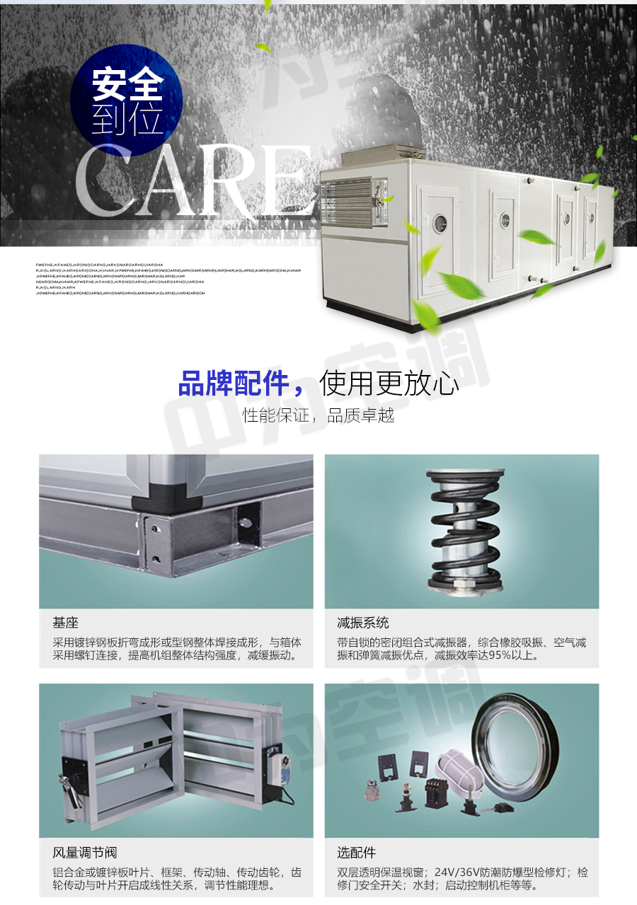 中為柜式空調機組可實現對空氣的加熱、冷卻、加濕、過濾凈化等多種功能。廣泛應用于賓館、商場、機場、醫院、寫字樓等大中型公共建筑的舒適性空調和電子、紡織、化工、制藥、食品等行業的工藝性空調。該機組不僅具有制冷供熱性能優越、噪音低、高度薄、結構緊湊、重量輕、安裝維護方便的優點,而且還可以配上調頻或調壓變速控制器后。按四季不同工況與現場空調場合匹配進行變風量節能運行。因此特別適用于建筑物緊湊的各類空調工程場合使用。