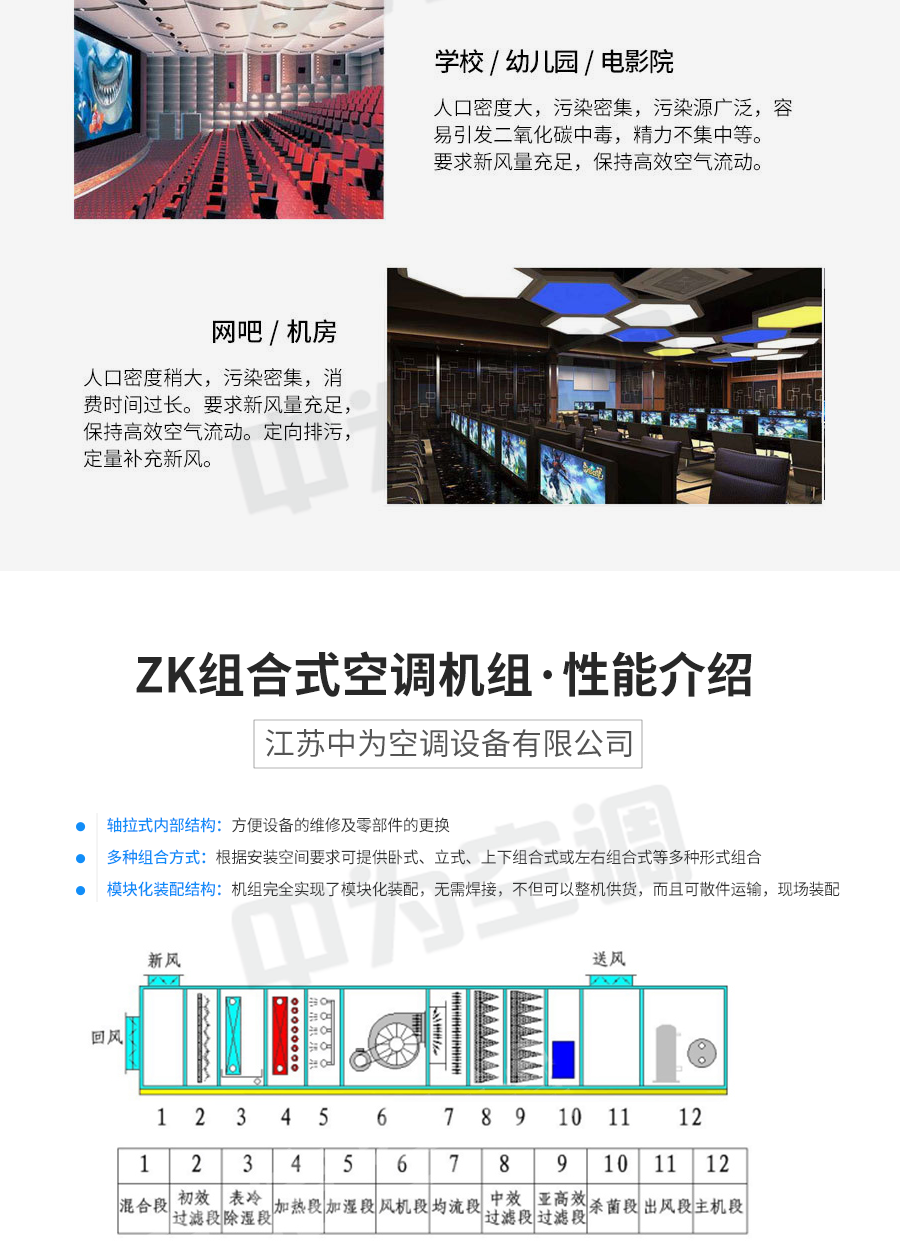 組合式空調機組可對空氣進行冷卻、干燥、加熱、加濕、過濾、凈化,并具有消聲功能。可廣泛適用于商場、賓館、寫字樓、體育館等需空氣集中處理的場合以及醫院手術室、制藥、卷煙、食品、精密儀器制造等凈化空調場合。